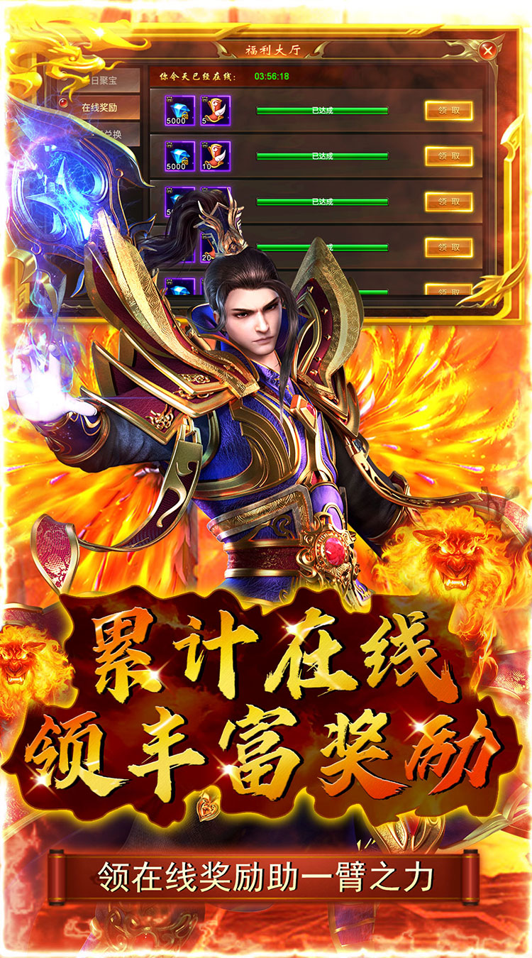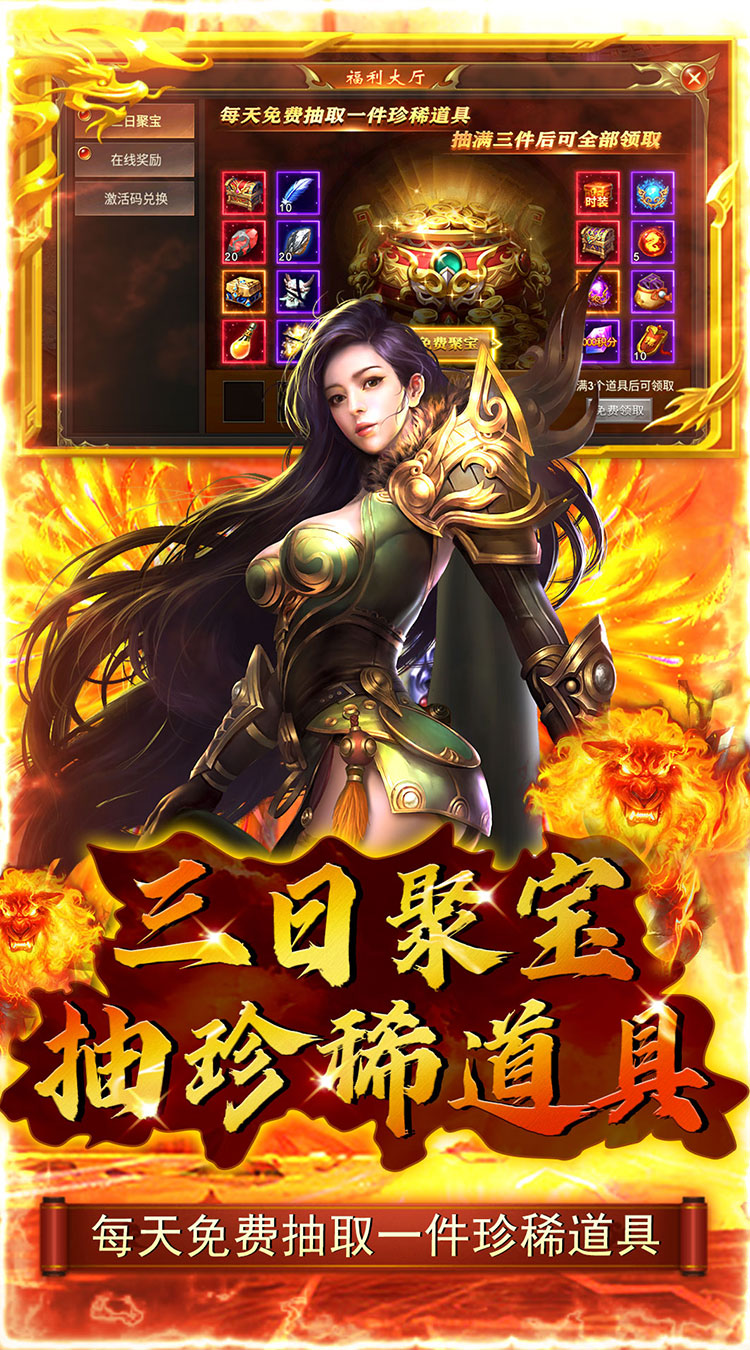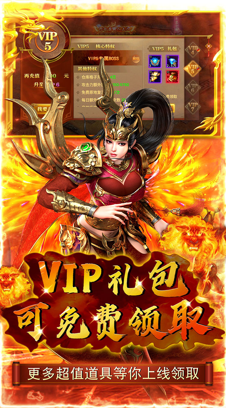 上线福利:送VIP5、100万元宝、“打金存钱人上人”称号、黄金战狮*1