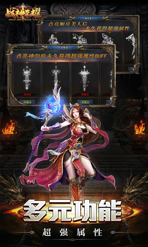 战神荣耀(全屏吸爽爆充),独家全屏吸怪功能,开局就送累充点,赞助免费领!超高爆率!超炫酷攻击特效!助你砍遍全图!范围群攻,跨服战斗,神器技能,炫彩魂环阵法,剑池铸剑,厢房娶美,特色玩法,特色全屏吸怪,活动boss无限刷!准点攻沙,等你称霸沙巴克!全新独家吸怪版本来袭!还在等什么,快来加入吧!