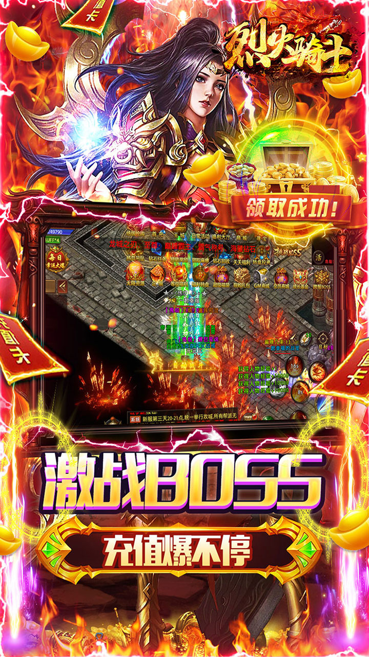 《烈火骑士》是一款全新的单职业动作冒险类传奇游戏!主要以升级、爆装备、攻沙、跨服远征为核心,丰富多样的玩法,华丽炫酷的时装特效,高清画质极致视觉盛宴。击杀BOSS可触发超级幸运红包大爆充值卡,免费直升满级VIP,闯关专属地图爆守护神装。还有每日跨服屠魔免费抽神壕套装!超高怪物爆率,元宝神器战装爆满屏,让你轻松刷怪,惊喜不断。怪物攻城、阵营战、沙城争霸、跨服远征、福利转盘、幸运翻牌等线上活动精彩不断。更有冠名专属、定制称号助你叱咤风云,威名远扬!战宠神威,唯吾独尊!热血狂爆,一战封神!