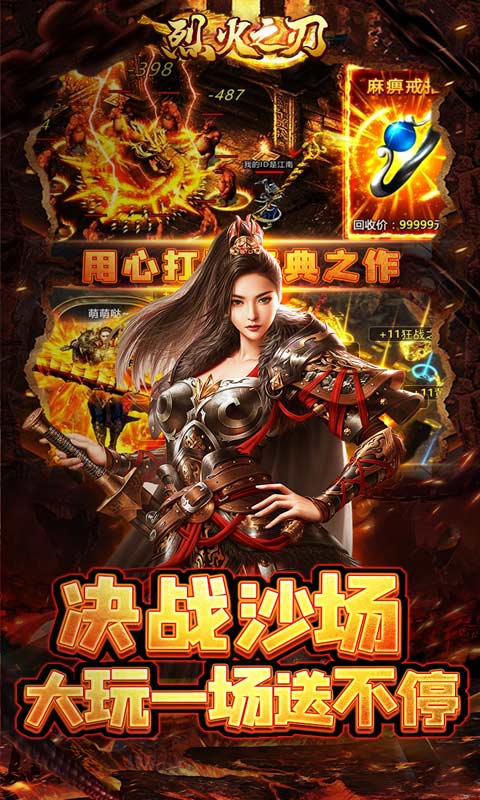 《烈火之刃》是一款经典复古传奇手游,散人追梦,超多装备!上线送新手道天装备、兔飞猛进称号、自动拾物、自动回收、神技·炎龙咆哮超值装备!上百张地图精彩纷呈,等你来战!游戏中还有热血沙巴克活动,集齐你的兄弟一起血战!超多奖励等你拿!
