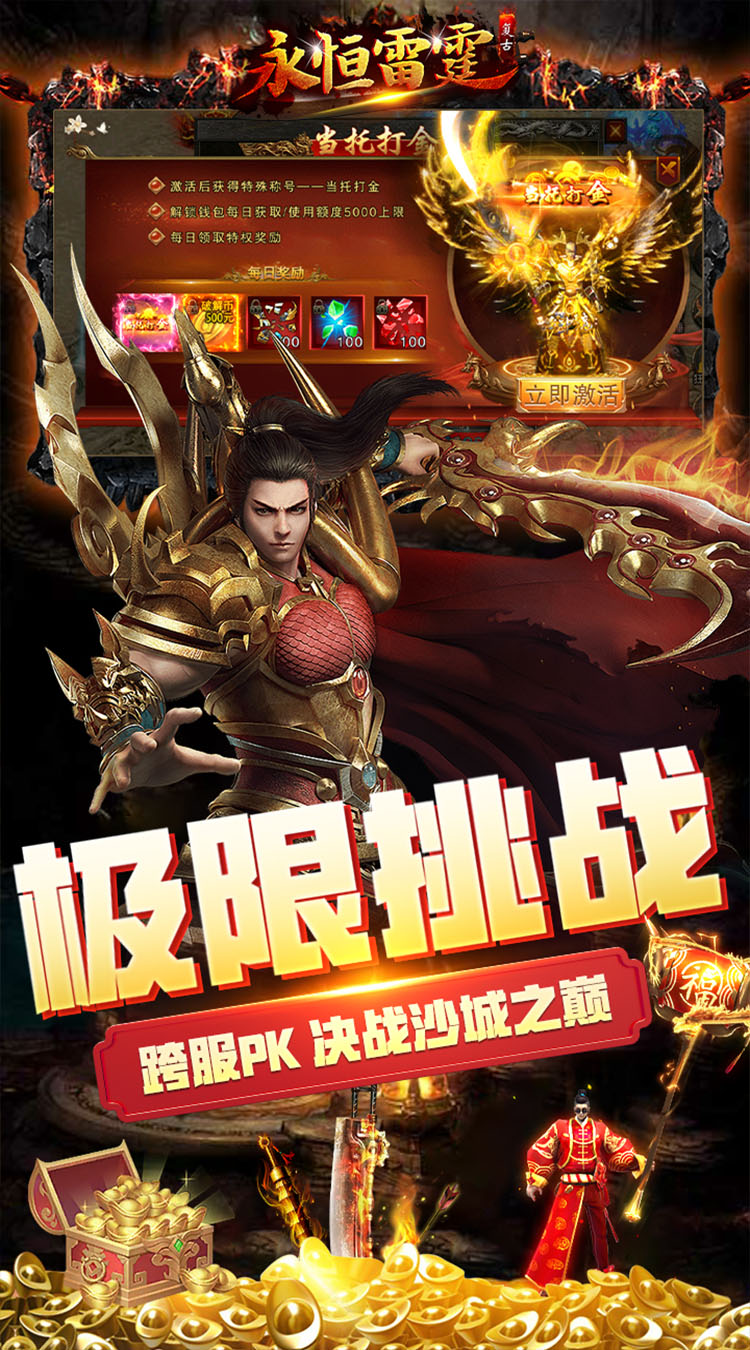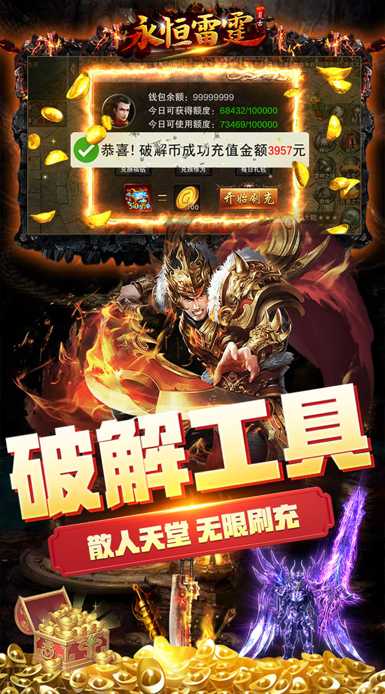 《永恒雷霆》上线送钻石20万,元宝1亿,主宰★魂环特权(破解工具领取),炫酷魂环外观。主线一点秒升百级,一款独创1秒99刀,无限攻速,爆率全开,时装、神兽任性爆。炫酷魂环异火,极致攻速伤害。极品吸血武器,刀刀暴击,刀刀吸血。神装降世,魔血加伤,秒天秒地,满屏爆光柱。装备全靠打,小怪爆终极。
