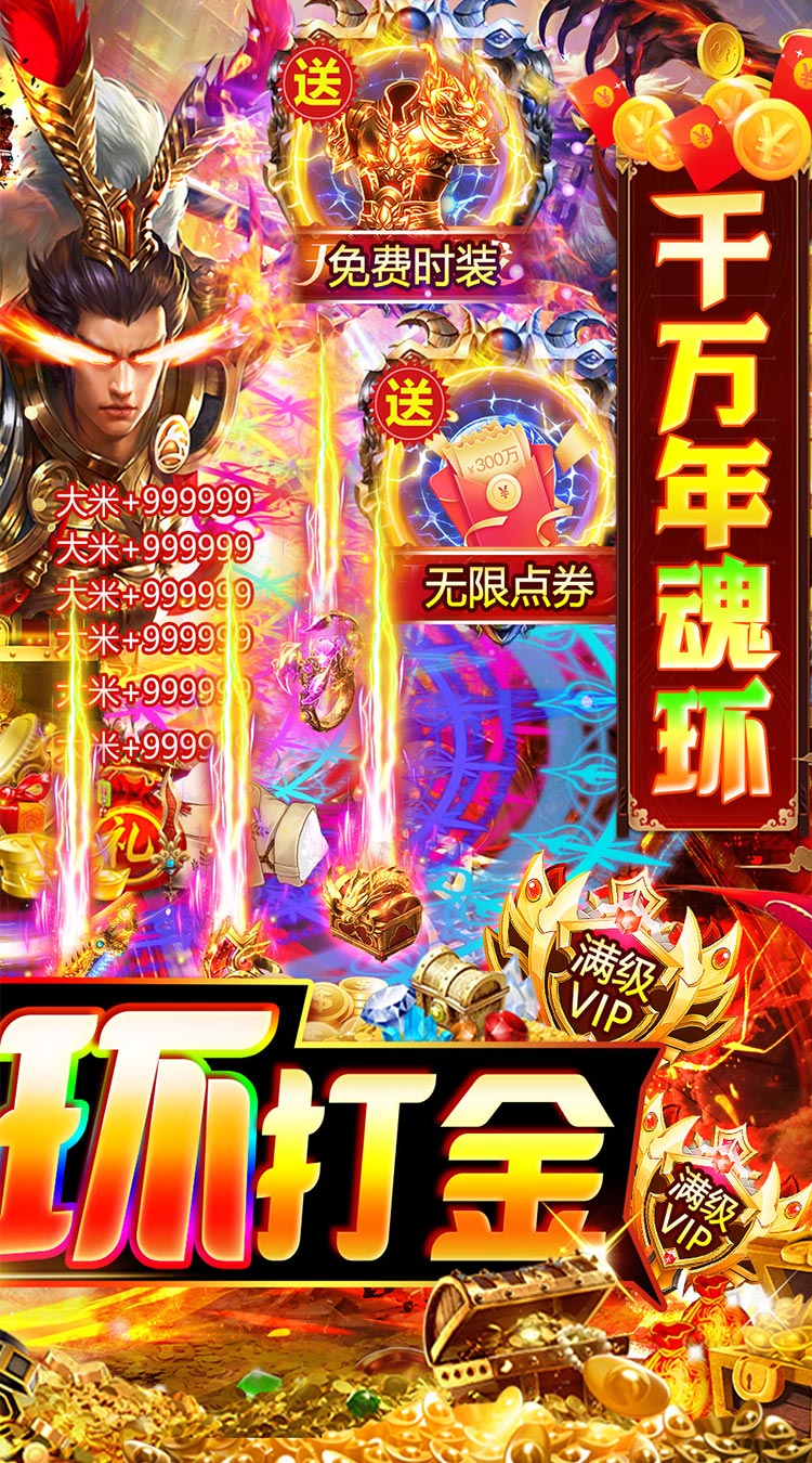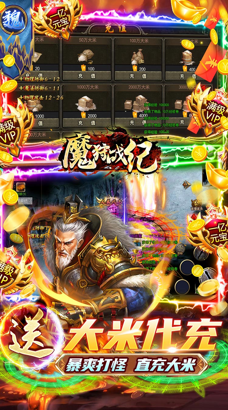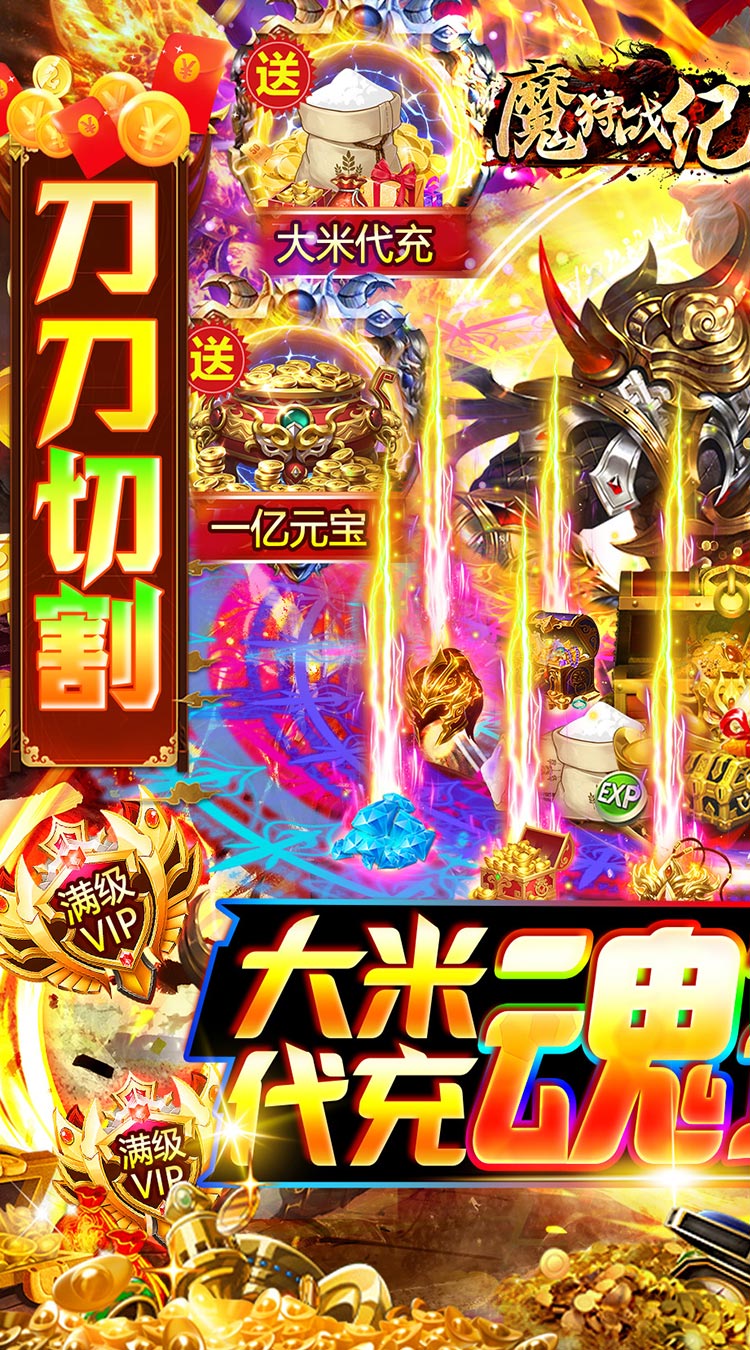 《魔狩战纪》全新大米代充,打怪获得代充券,使用可获得大米,真正的散人福利版本,还有全新特色魂环系统,魂环加成称霸三国!登录送代充魂环,完成任务送满级VIP,送无限点券,点券可兑换首充、自动回收、自动分解,超爽百倍爆率,万物皆可爆,满屏光柱,爆啥都是米!精英必爆点券!BOSS必掉大米!充值全靠爆!,一秒5刀,刀刀切割,砍怪如切菜,主线送关云长时装,三国传奇乱世等你来战!