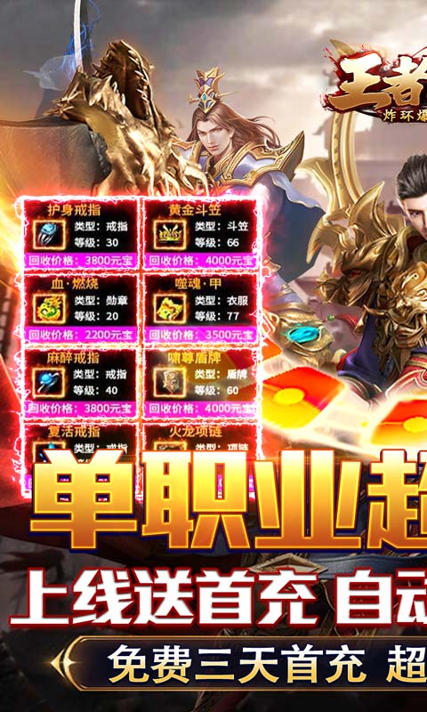 免费三天首充卡,88W元宝,时装.真龙神甲,暴力打金特权卡,魂环结晶
